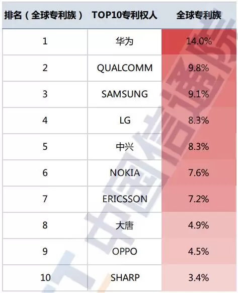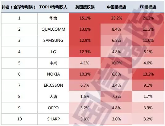 在5G有效全球专利族中,授权专利族15的占比达到67.1%。其中授权专利族排名前十位的企业依次是华为(17%)、三星(10.1%)、高通(9.8%)LG(9.5%)诺基亚(8.8%)、中兴(7.3%)、爱立信(5.8%)、大唐(4.6%)、OPPO(4.4%)和夏普(3.5%)。