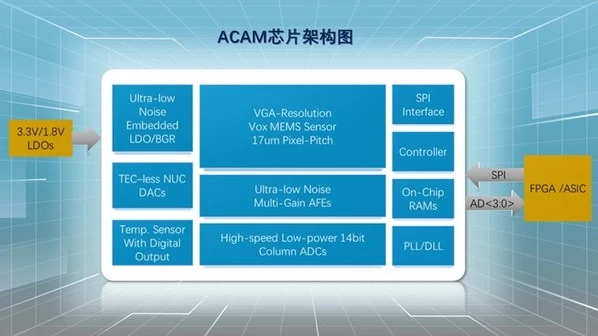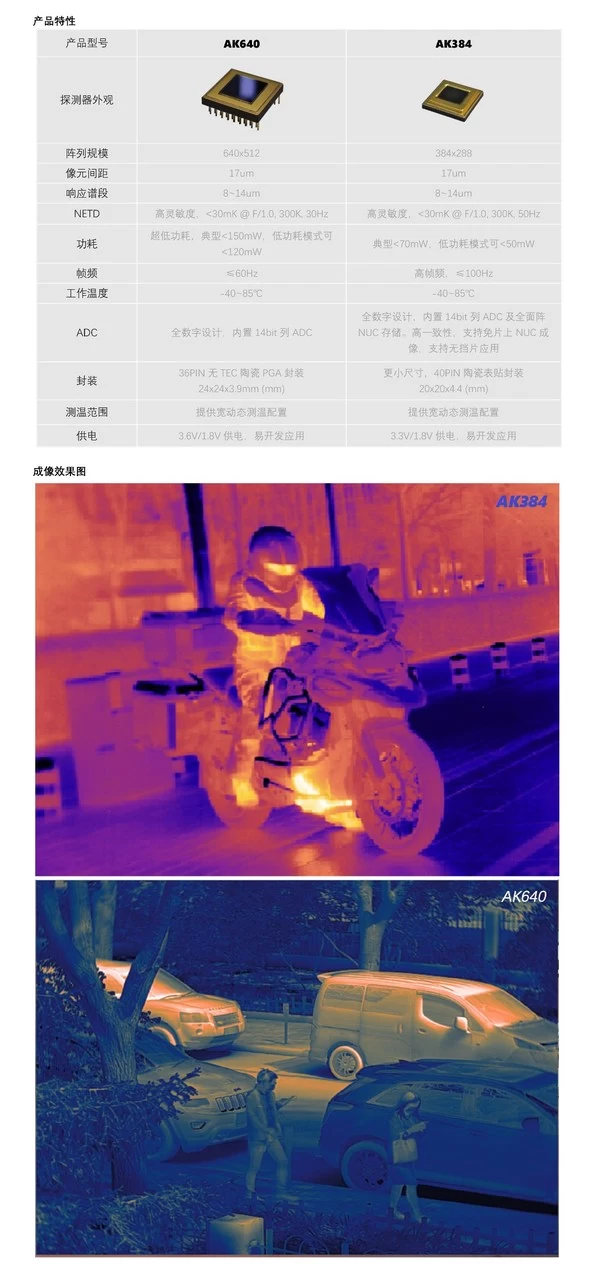 2、自研架构,低功耗、高帧频、高集成度:核心读出芯片采用多项授权专利技术加成的自研“ACAM”架构,片上集成14bit列级高速低功耗ADC,同时具备低功耗(AK384可低至50mW)、高帧频(AK384可高达100Hz)及高集成度的优点;