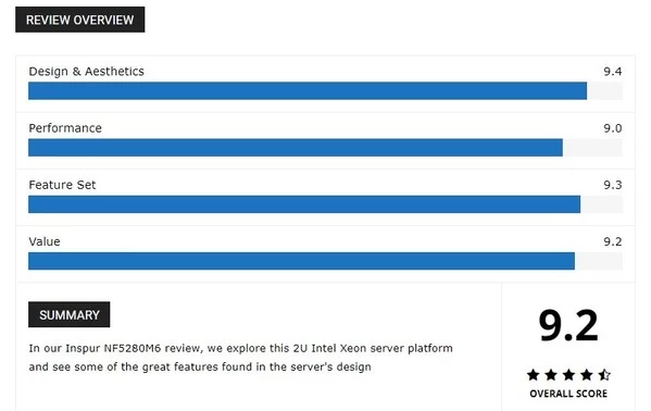 除了NF5280M6的内外部结构,STH也对服务器的性能、功耗、管理界面一一进行了评测,最后综合设计与外观、性能、功能、价值多维度指标,为NF5280M6评出9.2分高分。