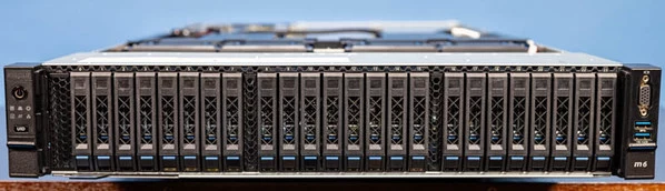 NF5280M6前方可配置3.5英寸和2.5英寸规格硬盘,本次评测机器前面板为24个小盘规格,每8个硬盘为一组,每组之间留有较大间隙,这也是目前服务器较常见的配置,可允许更多气流通过,更利于内部CPU、GPU等部件进行散热。