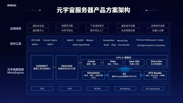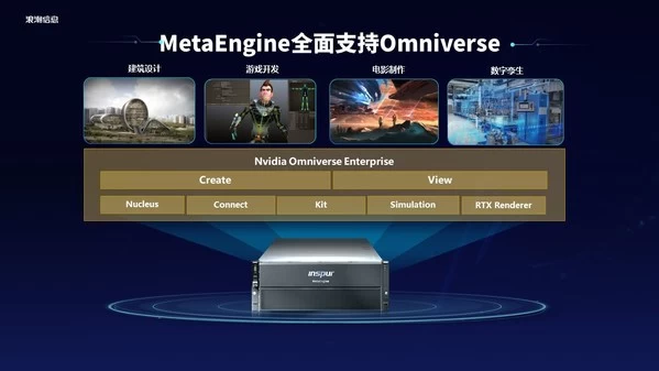当前,MetaEngine已经全面支持英伟达的Omniverse Enterprise,将高性能GPU 的图形计算、AI计算与高速存储访问、低延迟网络和精确计时相结合,是一个数据中心级的软硬一体解决方案,专用于为大规模数字孪生提供算力和应用支持,以实时创建和运行非常复杂的模型和逼真的仿真环境。