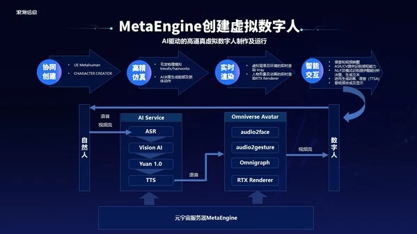 我们再以高逼真的交互型虚拟数字人的制作及使用为例,依然按照"协作建模---高精仿真---实时渲染---智能交互"的作业流程来看如何用MetaEngine创建虚拟人。