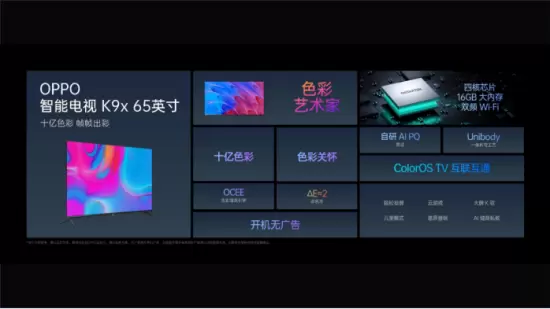 此次发布会的另外一款重磅新品OPPO 智能电视 K9x 65英寸,95%屏占比搭载4K超清硬屏。画质上延续了K9系列惊艳的色彩表现,支持10.7亿色色彩显示和OCEE色彩增强引擎,ΔE≈2,还原真实色彩,打造极致的观影体验。同时配合自研的AI PQ算法技术,针对画质全场景进行逐帧优化,确保每一帧画面都明暗清晰、立体饱满,实现媲美真实场景的视觉观感。