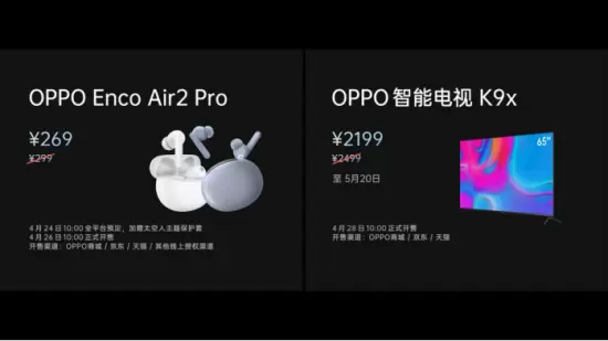 4月28日上午10点,OPPO 智能电视 K9x 65英寸在OPPO商城、京东、天猫平台正式开售,售价2499元。目前电视已全面开启预定,首销期间更可享受300元优惠,到手价只要2199元。预售期间还有腾讯视频会员月卡等权益赠送。