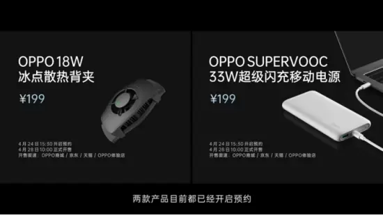 OPPO 18W冰点散热背夹、OPPO SUPERVOOC 33W超级闪充移动电源售价均为199元,并于4月28日上午10:00正式开售。