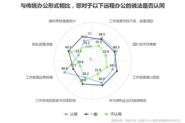 《报告》显示,40.1%的受访者认为远程办公增加了工作压力,45.0%的认为远程办公降低了工作效率,30.0%的认为远程办公降低了企业软性福利水平,这三项统计中,受访者对于远程办公的负面评价占比均高出正面评价8-15个百分点不等。受访者分别在“工作家庭边界模糊”(46.8%)、“团队协作效果差”(40.3%)、“工作信息效性不足,容易滞后”(38.5%)、“远参与感和企业归属感降低”(36.9%)等方面对远程办公提出了质疑。