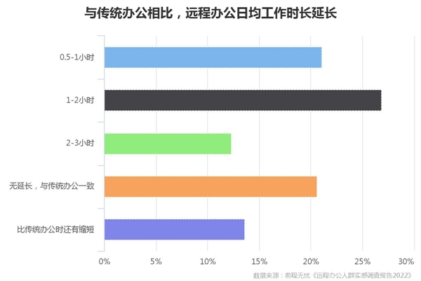 在背景下,《报告》显示,相较传统办公,65.8%的受访者表示远程办公下的日均工作时长不同程度的“被延长”。其中,日均工作时长延长1-2小时的占比26.9%,日均工作时长延长0.5-1小时的占比21.1%,日均工作时长延长2-3小时的占比12.3%。但也有20.6%的受访者表示远程办公下的日均工作时长与传统办公时一致,甚至另有一成多的表示远程办公下的日均工作时长较传统办公还有缩短。