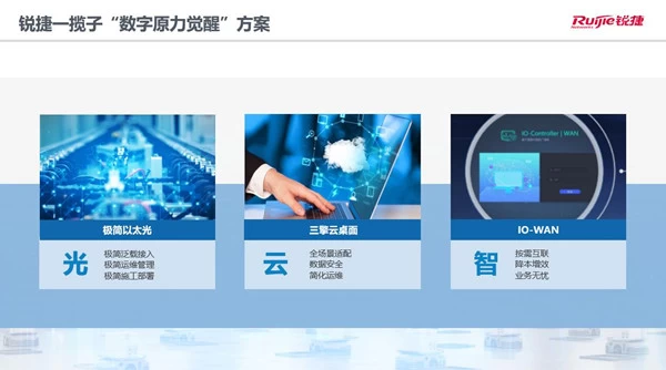 正如前面所说,“数字原力觉醒计划”旨在通过极简光、三擎云桌面、SD-WAN方案,以光、云、智之力,助力企业觉醒数字力量,提高竞争力,并通过锐捷网络优异的全场景创新能力及丰富的全行业数字化转型经验,使用户悦享转型体验。
