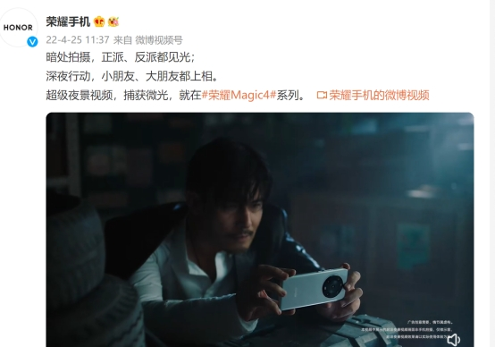 随着4月22日荣耀Magic4 Pro和至臻版全面开售后,荣耀Magic4系列在高端市场热度持续走高。今日,荣耀官方发布一则创意视频,形象演绎了荣耀Magic4系列“超级夜景视频”功能,捕获微光,带来极致夜景视频拍摄体验。