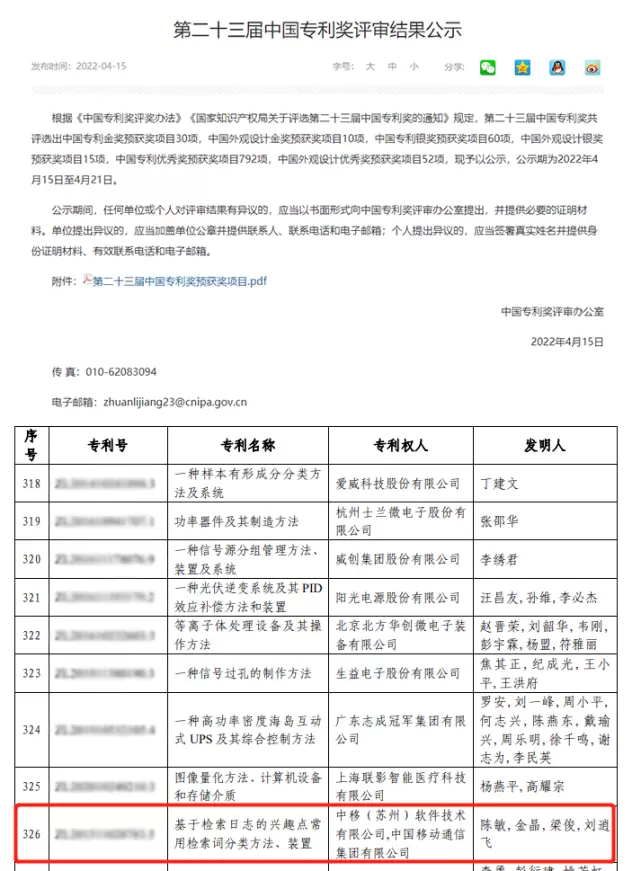 在2022年4月26日,第22个世界知识产权日来临之际,国家知识产权局公布了第二十三届中国专利奖获奖名单,中国移动云能力中心凭借发明专利《基于检索日志的兴趣点常用检索词分类方法、装置》荣获中国专利优秀奖。据悉,中国专利奖由国家知识产权局和世界知识产权组织共同主办,是我国唯一专门对授予专利权的发明创造给予奖励的政府部门奖。