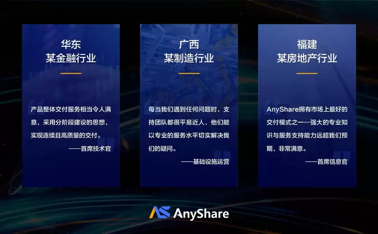 AnyShare在服务与支持维度评分最高,4.6分位列第一。从以下客户评论中可以看出,AnyShare以专业的服务水平、强大的技术支持以及高质量的交付方法为客户带来了更优的服务体验。