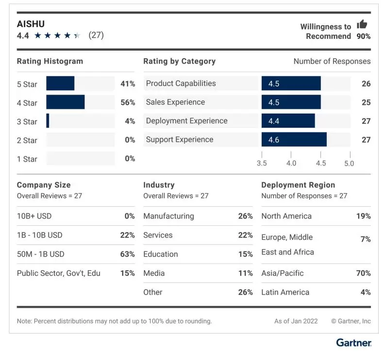 AnyShare在“客户之声“收获了4.4分(总分5)总评分,仅次于Microsoft和Laserfiche。其中有97%的客户打出了四星以上的高分,41%的客户给予了五星好评,客户整体推荐意愿高达90%。