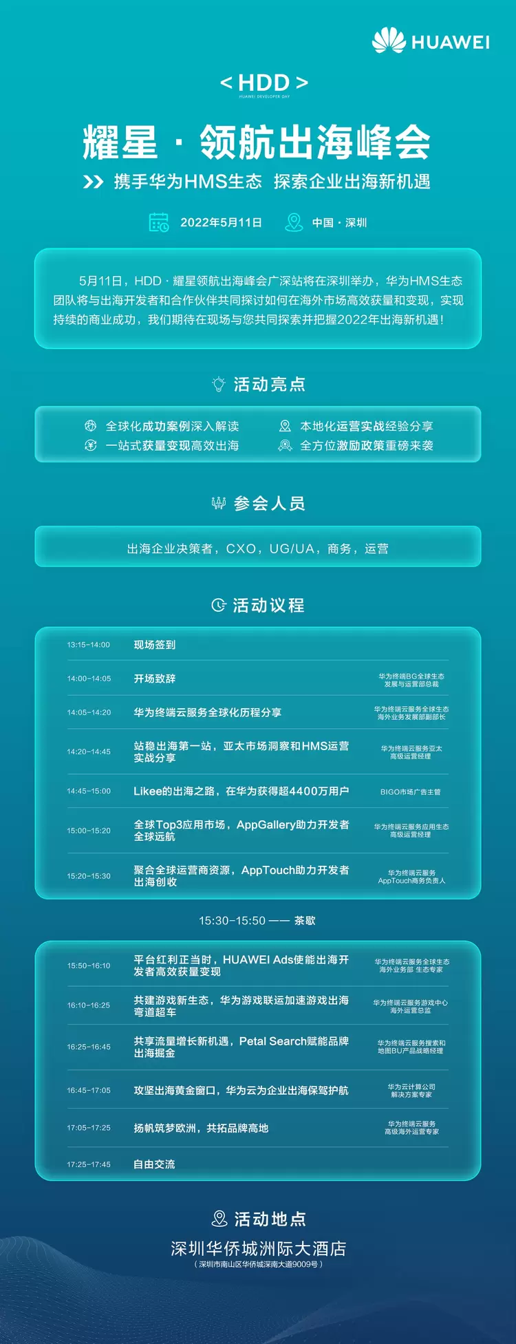 5月11日,在HDD·耀星领航出海峰会(广深站)上,华为HMS生态团队将与出海开发者和合作伙伴一起探讨如何在海外市场高效获量和变现,分享出海成功案例,以助力更多开发者在全球市场实现持续的商业成功。
