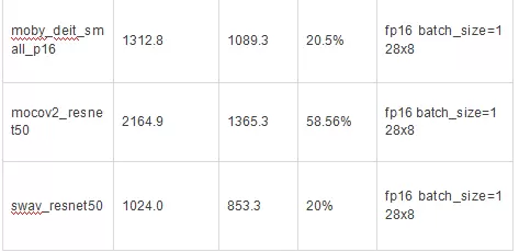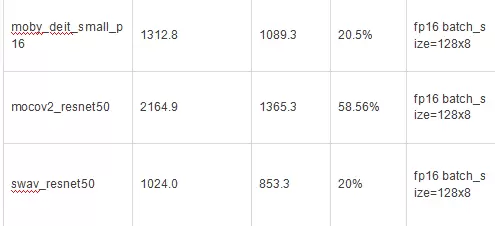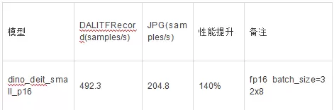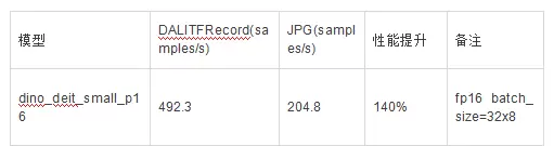 此外,针对特定任务,框架会做针对性优化,例如自监督训练需要使用大量小图片进行预训练,EasyCV使用tfrecord格式数据对小文件进行封装,使用DALI对预处理进行GPU加速,提升训练优化性能。下图是使用DALI+TFrecord格式进行训练,和原始图片训练的性能对比。