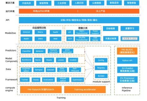 ·推理:EasyCV提供了端到端的推理API接口,支持PAI-Blade进行推理优化,并在云上产品支持离在线推理。