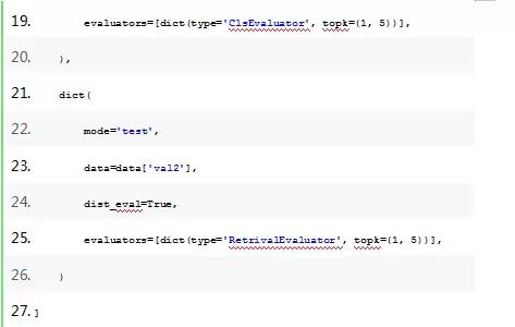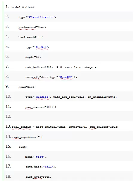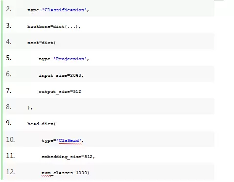 1、如技术架构图右侧所示,所有的模块都支持注册、通过配置文件配置使用Builder自动创建,这就使得各个模块可以通过配置进行灵活的组合、替换。下面以model和evaluator配置为例,用户可以简单的通过配置文件修改切换不同的backbone,不同的分类head进行模型结构调整。在评估方面支持用户指定多个数据集,使用不同evaluator进行多指标评估。