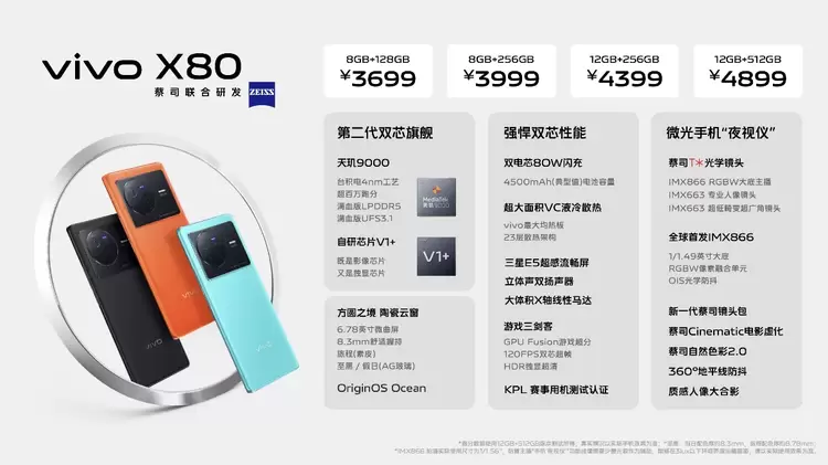 发布会也公布了vivo X80和vivo X80 Pro天玑9000版的售价。其中vivo X80 8GB+128GB版、8GB+256GB版、12GB+256GB版和12GB+512GB版本售价分别为3699元、3999元、4399元以及4899元。