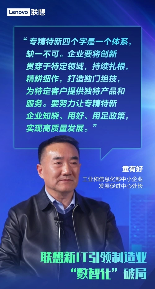作为全球ICT行业的领导企业之一,联想积极与国家政策同频共振。联想正为中小企业提供技术、资金、人才、平台等多方面支持。在联想供应链企业中“专精特新”企业共35家,单项冠军企业15家,单项产品冠军7家。通过联想创投,联想已经成功投资超过200家优秀科技企业,近40家成为细分领域独角兽,10余家被投企业上榜“专精特新小巨人”企业榜单。