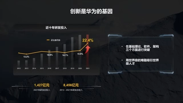 首先谈谈华为的创新。华为成立三十多年来,一直通过创新为客户、为社会创造价值,创新已经成为我们的基因。近几年来,华为虽然面临经营上的困难,但在研发上的投入,没有减少反而在增加,从过去年收入占比10%,提高到去年的22%。
