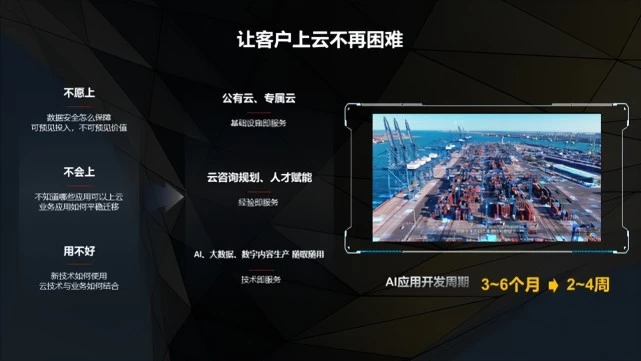 关于怎么帮助客户用好云,我想分享一个天津港的案例。简单来说,天津港是一个每年集装箱吞吐量近两千万箱的大型港口,它的作业计划是个非常复杂的系统工程,必须借助AI等技术手段来提升效率。传统方式下,需要购置设备,搭建开发环境,采集数据,再启动算法开发,至少花费3-6个月时间才能完成,现在利用华为云上资源和AI求解器开发环境,只要2-4周时间,极大提升了港口应用的开发效率。