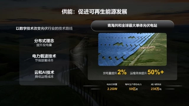 举个例子,在青海戈壁滩,我们助力客户建成了全球最大的2.2GW单体光伏电站,通过把云和AI技术用到光伏电站,使发电量提升超过2%,运维效率提升超过50%。