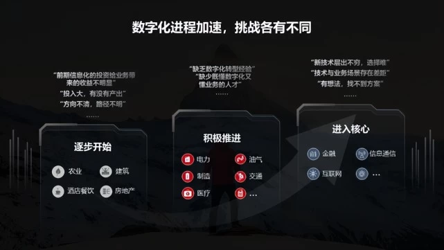 但是我们也看到,不同的企业、不同的行业,在数字化的进程中,所处的阶段不同,比如信息通信和金融行业等,数字化转型是比较早的,数字化已经进入核心生产系统;电力,油气,制造等行业,也正在推进数字化解决生产场景问题;而地产、建筑、农业等行业,才刚刚开始数字化进程。