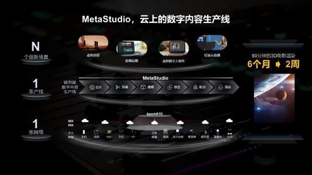 更进一步,MetaStudio将影视制作的剪辑、建模、合成等全流程都搬到了云上,让影视创作者可以无缝的异地协作、大幅提升制作效率,一部电影大片的内容制作周期,可以从几年缩短到几个月。