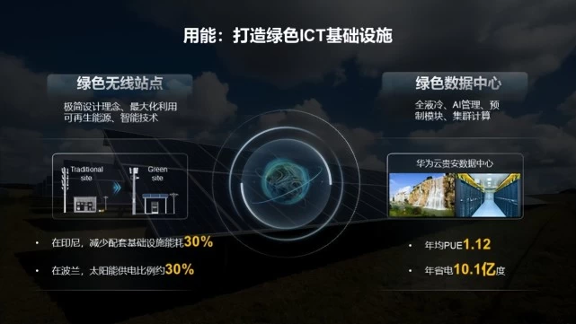 最后,我想谈谈低碳化。我们坚信,数字技术是实现低碳发展的使能器。华为在对于低碳发展的贡献,主要聚焦在两个方面,一个是供能侧,一个是用能侧。