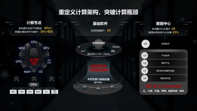 第二,在基础软件架构层面,未来,融合高性能计算、人工智能、大数据分析等多种计算模式的需求,会越来越多。我们将持续打造多样性计算融合架构,把不同XPU专属的加速库、编译器等基础软件进行重构,提升应用软件开发效率和实现性能倍增;