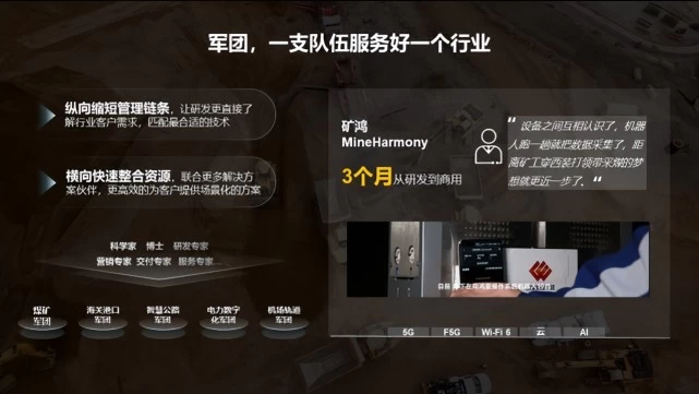 这种运作模式当前已经收到了一些效果。这里我给大家举个例子,比如最早成立的煤矿军团,就已经与客户一起完成了基于鸿蒙开发的煤矿操作系统,我们把它叫矿鸿。矿鸿操作系统实际上解决了在煤矿作业环境下,各种各样设备联通的问题,用我们客户的话来说,“设备之前互相认识了,机器人跑一趟就把数据采集了,距离矿工穿西装打领带采煤的梦想就更近一步了”。