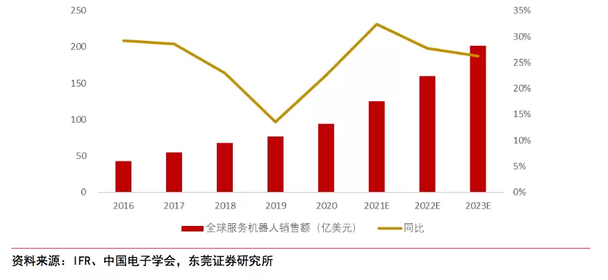 而更广义、空间更大的服务机器人行业更是一片广阔的蓝海:IFR预计,全球服务机器人销售额2020-2023年将有28.73%的复合增速,销售额将达201.8亿美元。