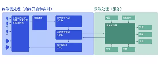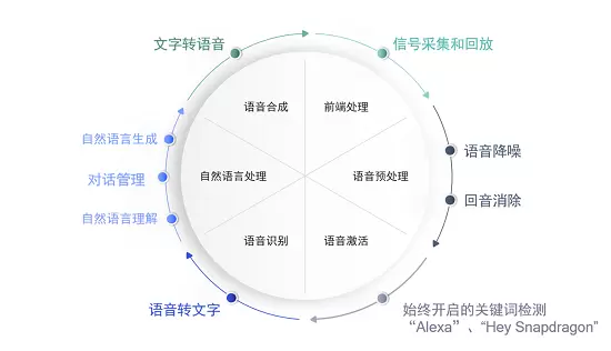 要实现端到端的语音交互体验,其中需要多个组件的支持(见图1)。语音交互的流程是这样的:首先麦克风采集语音信号,然后是语音预处理、语音激活、语音识别和自然语言理解,最终是终端通过语音合成的方式响应用户。由此可见,端到端的语音交互是个多步骤的复杂流程。