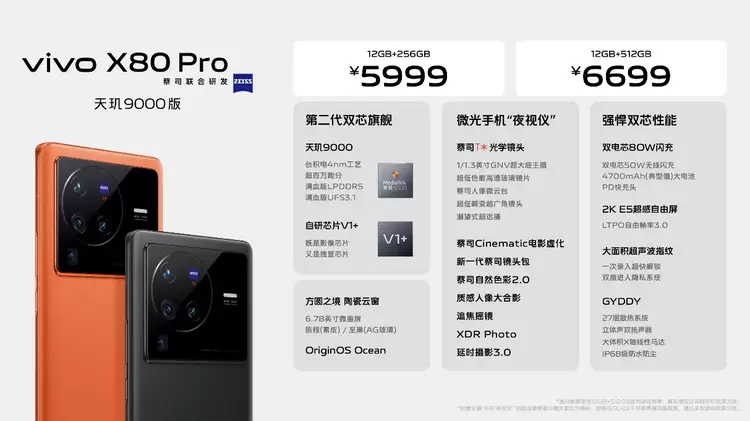 vivo X80 Pro天玑9000版12GB+256GB版和12GB+512GB版本价格分别为5999元、6699元。