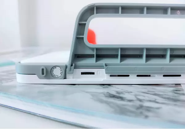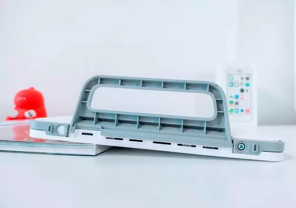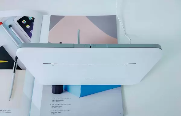 在外观设计上,华为移动路由Pro依旧采用了平板设计,三围尺寸仅为219*138*25.6mm,仅有一个记事本大小;重约为330g,相比上一代稍重(246g)。整体为白色设计,但腰线部位与支架的灰色保持一致。