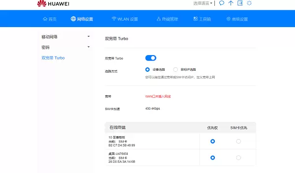 其次华为移动路由Pro支持双网双通,也就是说有线宽带和4G网络可以同时存在并同时工作。对于不同终端的联网需求,在双宽带 Turbo页面还可以针对每一个终端进行网络设置是宽带优先还是SIM卡优先;所有的联网终端也是一目了然。