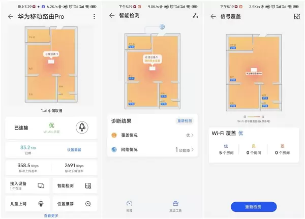 在去年华为H6路由上市时,华为便在路由当中带来了“可视化智能诊断”功能,可视化智能诊断功能支持用户自主编辑户型图,用户可以在自家户型图中加入华为移动路由Pro,判断路由器的实际Wi-Fi覆盖情况。当出现一些网络问题,也能通过一键诊断实现自动排障,少部分无法上网的问题也会指导用户手动排障。