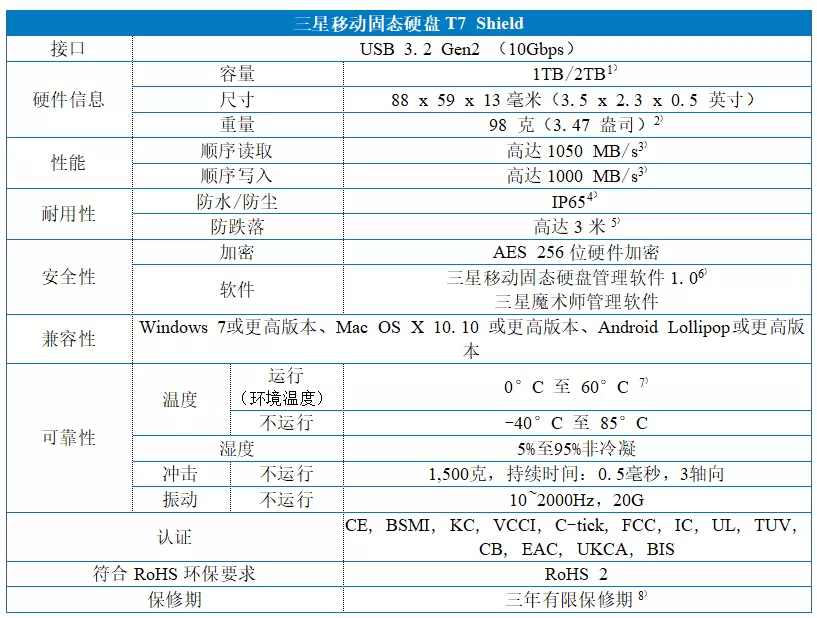 8)三星电子对任何损失概不负责,包括但不限于三星电子产品和存储设备中包含的数据或其他信息的丢失,或用户可能遭受的利润或收入的损失。欲获取更多关于保修期的信息,请访问https://samsung.com/portable-ssd