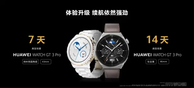 延续GT家族长续航的基因,华为WATCH GT 3 Pro钛金属款典型场景续航达14天,重度场景续航达8天;华为WATCH GT 3 Pro陶瓷款典型场景续航达7天,重度场景续航达4天。全系支持无线快充功能,充电速度较上一代提升30%,充电10分钟,典型场景下使用一整天,时刻状态在线(*数据来源于华为实验室)。
