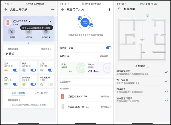 华为路由器的特点之一,儿童上网保护,毕竟在这种网络大环境下,适可而止地限制一下孩子上午时间是很有必要的,当然如果孩子在家上网课,这个必须全力的支持。华为给出来多个场景控制,家长可以灵活操控,这里就不一一介绍了,至于 双宽带Turbo以及网络检测这里就不过多介绍了。