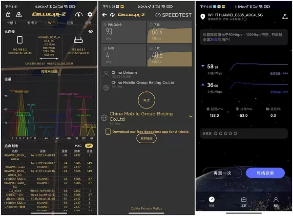 使用软件对华为移动路由Pro插入4G卡的无线网络进行了简单的测试,我们来看看速度怎么样,信号强度为-26dBm(数值越小越好),其实同一个地方,你手机稍微的动一下,信号强度就会有很大的改变。通过软件的测试,无论是信号强度和速率都有小幅度的下降,不过也就在接受范围内。