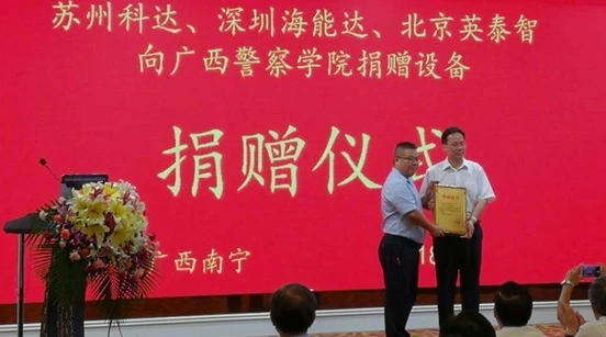 论坛的最后,举办了广西警察学院战略合作单位捐赠仪式,广西警察学院党委书记覃干超出席了活动,科达营销中心副总经理李彧峰出席了捐赠仪式并发言,表示要以捐赠活动为契机,积极与广西警察学院联合打造建设公安信息化实验室,以服务公安实战为目标,进行技术创新、新产品研发,实现产、学、研一体化运作,互利共赢。