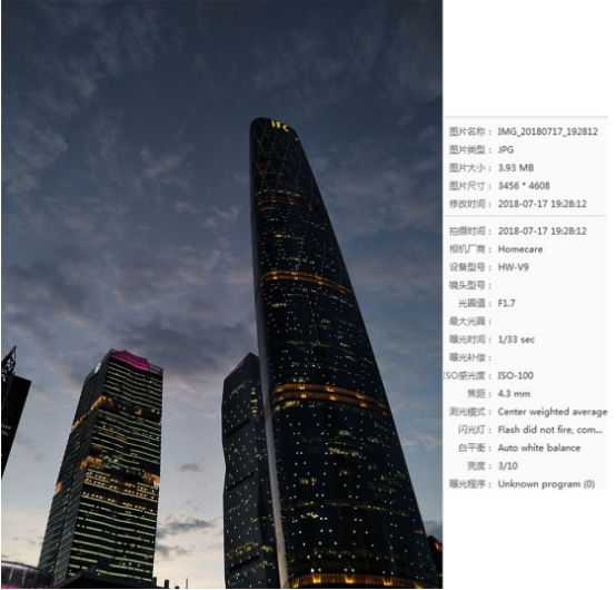 上面的两张照片中,分别在不同时间段拍摄,前一张正常曝光,成像锐利,细节丰富。重点说下第二张,这个时候是光线已经暗下来时,但照片效果也还不错。由拍摄参数可以看到,广州19点28分,在低感光度ISO-100,曝光时间1/33秒的情况下,依然拍到了清晰的照片,让人惊叹这款手机AI拍摄的防抖能力。再来看照片中的亮部,主要是建筑物的灯光,都保持在一个可以接受的亮度范围内,且没有过曝。而暗部的细节相对少一些,属于一个正常情况。画面整体的质感不错,没有一般手机严重的涂抹感。