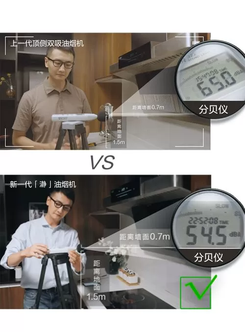在家居环境下真的能做到十分安静吗?中国家用电器研究院在环境噪音为35分贝左右的真实厨房环境下,分别对A.O.史密斯两代顶侧双吸油烟机进行了测试。