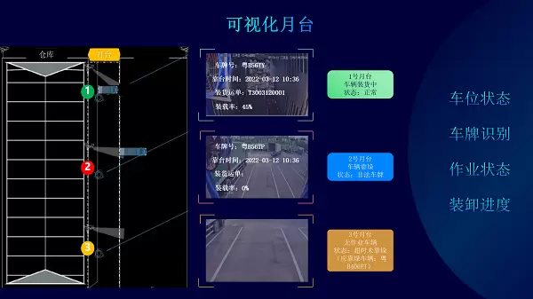 在可视化月台方面,有引入400万星光级数字化专用智能摄像机,高分辨率可达2560 × 1440 @25 fps,在该分辨率下可输出实时图像,支持背光补偿,强光抑制,3D数字降噪,适应不同监控环境。同时设备采用深度学习硬件及算法,进入区域侦测和离开区域侦测等等;可实时采集月台车辆进、出状态,支持对月台出入车辆车牌号抓拍识别,同时支持对厢式车货车车厢开关门状态、月台作业状态识别、货车车厢可视范围内装载率即装载进度识别。