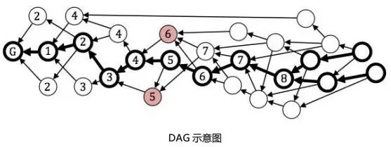 DAGX 基于“主链”概念,也就是经过见证人认定的最短路径 MC 的 Parents 优选算法。主链创造了一个全网共识确定的交易时间序列,优雅的避免了双花问题。