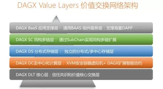 DAGX 创造性提出了 DAGX Value Layers 分层网络架构体系:其中 DAGX 区块链作为下一代网络的核心组件- 1.信任共识和价值交换层,其上依次是 2.去中心化计算层(合约链)、3.分布式存储层、4. 同构跨链层、5. BAAS Dapp 应用支撑层、,共同组成可商用价值交换网络。