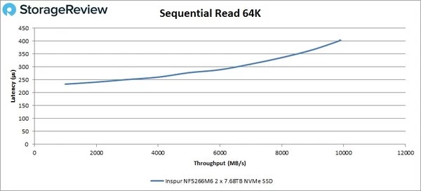 在工作负载测试方面,测试得出的性能亮点包括4K随机读取时的1,416,752 IOPS,SQL工作负载的451,681 IOPS,以及Oracle工作负载的491,131 IOPS。当配置2个7.68TB的Solidigm P5510 SSD时,在64K顺序测试中,从读取性能开始,在NF5266M6速率为9,882MB/s,延迟为404µs时结束测试。考虑到只用了2个NVMe硬盘,这个表现也很不错。