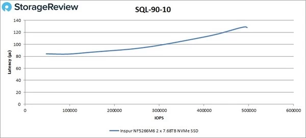 在基于SSD的测试中,SQL工作负载包括SQL Workload、SQL 90-10和SQL 80-20。SQL 90-10延迟较短,在延迟为84µs,IOPS为47,578时开始SQL工作负载,峰值为128µs和496,215 IOPS。