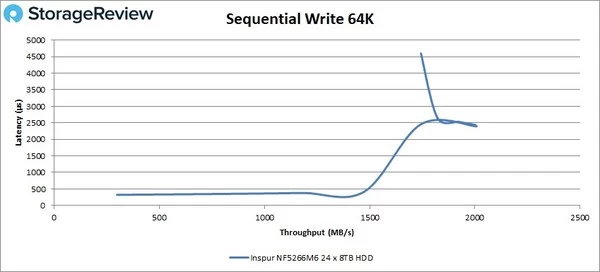 而当配置24个8TB硬盘时,64K顺序写入,NF5266M6的峰值达到了2,007MB/s。
