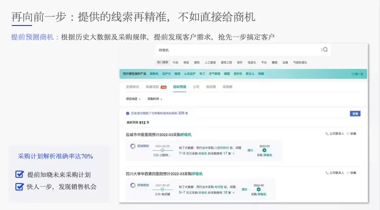 这一点,百炼智能可以说是精准营销赛道上是先行者。我们可以根据历史大数据及采购规律,提前发现客户需求,抢先一步触达客户。以招标预测这个场景为例,我们监测到上海的某家医院新采购一辆救护车,通过历史数据分析,通常再过一个月它就会采购车上的监测设备,那么下个月很可能就会紧接着买血糖仪、血压仪等设备。这时候将采购计划提前通知给销售,销售就可以去提前谈合作了。